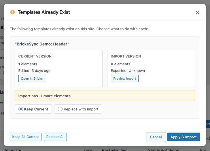 When data collides, BricksSync shows a side-by-side comparison with plain-English summaries like “Import has 3 more elements.” Choose per item: keep local, replace, rename, or merge. Dry-run preview before committing.