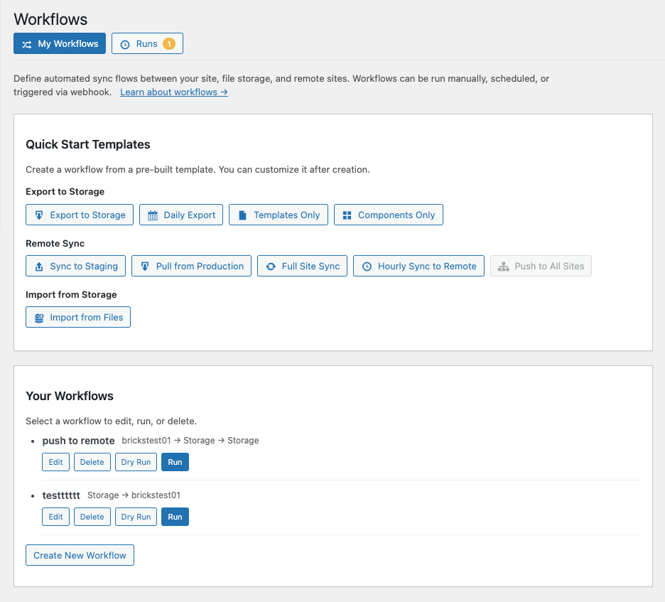 BricksSync supports pushing and pulling of templates, settings, components, content and plugin data from a master site.