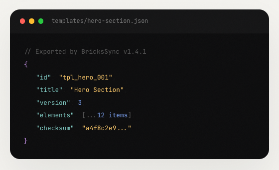 BricksSync stores templates, settings, components, content and plugin data as plain JSON.