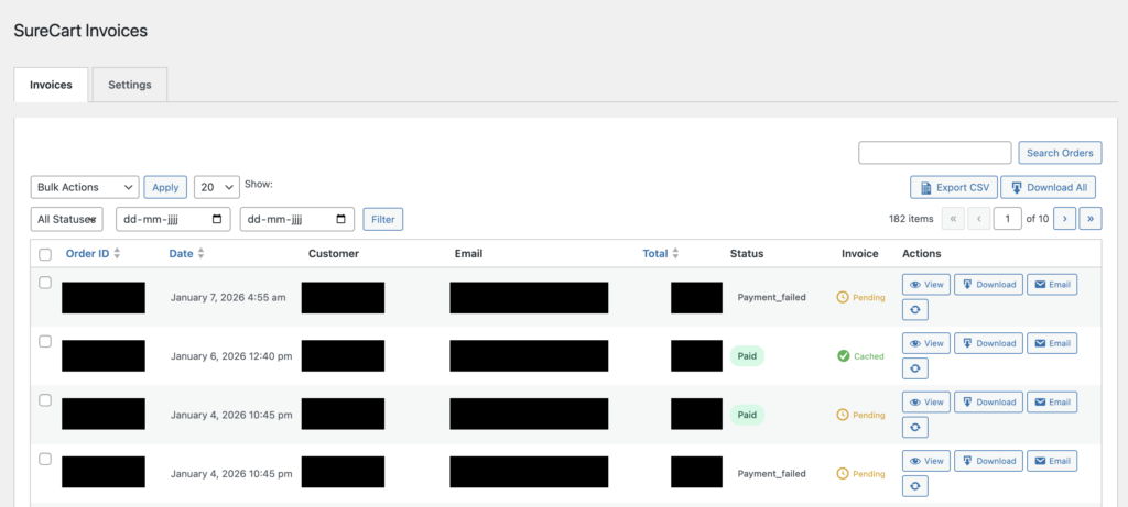 - Export CSV – Export order data to CSV for accounting/reporting